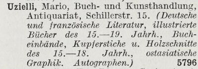 Aus welchen Gründen sich Tiedemann und Uzielli 1925 tatsächlich trennten, ist unklar. Nach eigenen Angaben liefen die Geschäfte von Mario Uzielli in den Jahren danach nicht schlecht. Einer Annonce aus dem Jahr 1927 zufolge bildeten Deutsche und französische Literatur, Illustrierte Bücher des 15. bis 19. Jahrhunderts, Bucheinbände, Kupferstiche und Holzschnitte des 15. bis 18. Jahrhunderts, Ostasiatische Grafik sowie Autografen die Schwerpunkte des Uzielli´schen Geschäft. Der gebürtige Frankfurter Wilhelm Henrich (1906-1980), der als Lehrling im Geschäft begonnen hatte, wurde sein Mitarbeiter. Dass Mario Uzielli der aktuellsten und jüngsten Kunst verbunden war, lässt sich daran ablesen, dass die Buch- und Kunsthandlung ab 1928 als Verkaufsstelle der Arbeiten aus den Werkstätten der Kunstschule Frankfurt fungierte. Auch die österreichische Malerin Marie Elisabeth Wrede (1898-1981), die mit einem Enkel Charles Hallgartens (1838-1908) verheiratet war, zeigte im selben Jahr ihre Zeichnungen bei Uzielli. Im Jahr darauf waren es Plakatarbeiten des französischen Künstlers Henri de Toulouse-Lautrec, welche er dem Frankfurter Publikum präsentierte.