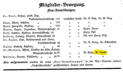 Über weitere Tätigkeiten Uziellis in der Sektion wissen wir nur wenig. Im Mitgliederverzeichnis des Jahres 1925 ist er mit dem Beitrittsjahr 1914 aufgeführt, sodass er trotz Weltkrieg und Nachkriegswirren bis dahin ununterbrochen Mitglied der Sektion Frankfurt am Main gewesen ist. Laut Nachrichten-Blatt der Sektion vom Juni 1932 empfahl Mario Uzielli zusammen mit Wilhelm Kratz, der bereits seit 1903 Mitglied der Sektion gewesen ist, die Aufnahme von Dr. Alfred Wolters, Direktor der Städtischen Galerie, und seiner Tochter Renate Wolters, Schülerin, beide wohnhaft Morgensternstraße 30. Noch im Februar 1933 berichtete das Nachrichten-Blatt der Sektion, dass er zusammen mit Dr. A. Salomon die Aufnahme von Walter Bertheim, Kaufmann, Waidmannstr. 21, empfohlen hat. Folglich unterstützte Mario Uzielli die Sektion durch Werbung neuer Mitglieder selbst noch am Beginn der NS-Diktatur.