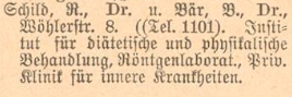 Ab April 1903 praktizierte Dr. Rudolf Schild wieder in Frankfurt am Main, und zwar zusammen mit Dr. Bernhard Bär (1874-1912), einem Schwager des Arztes Theodor Plaut. Beide übernahmen das "Institut für diätetische und physikalische Behandlung" in der Wöhlerstraße 8 von Georg Kratzenstein, das dieser aus gesundheitlichen Gründen aufgegeben hatte. Laut des Frankfurter Adressbuches von 1906 betrieben Schild und Bär eine Privatklinik für innere Krankheiten und besaßen bereits ein Röntgenlaboratorium. Sie gehörten damit zu den Ärzten, die bereits früh mit Röntgenstrahlen arbeiteten. Entsprechend war Rudolf Schild Mitglied der 1905 in Berlin gegründeten Deutschen Röntgengesellschaft. Er demonstrierte die Ergebnisse seiner röntgenologischen Tätigkeit auch im Ärztlichen Verein zu Frankfurt.