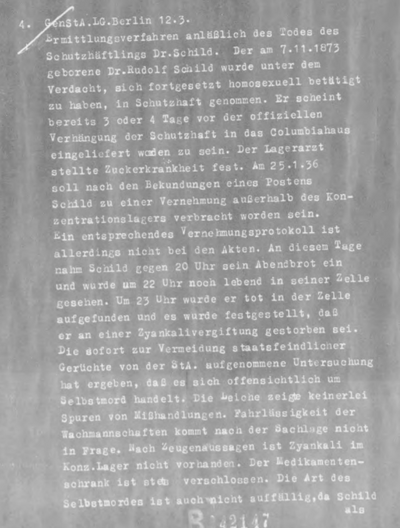 Dr. Rudolf Schild wurde 1935 in Berlin in mehreren polizeilichen Verhören von sogenannten "Strichern" als männlicher Sexualpartner benannt. Im Rahmen eines Ermittlungsverfahrens gegen den homosexuellen jüdischen Rechtsanwalt Kurt Fontheim wurde auch gegen Rudolf Schild ermittelt. Schließlich ist er am 7. Januar 1936 verhaftet und in das Konzentrationslager "Columbia-Haus" verschleppt worden. Dieses Vorgehen beruhte auf verstärkten Razzien auf Homosexuelle im Zuge der im September 1935 in Kraft getretenen Strafverschärfung des §175 StGB.