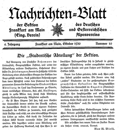 Laut Nachrichten-Blatt Nr. 3 vom Mai 1933 ist der Geographie-Professor Dr. Walter Behrmann, der damals in der Feldbergstraße 7 wohnte, per Übertritt von der Sektion Berlin des DuOeAV Mitglied der Frankfurter Sektion geworden. Vorher hatte er seit 1921 der Berliner Sektion angehört. Doch bereits vor seinem Sektionswechsel ist er für den Ausbau der Sektion Frankfurt am Main aktiv geworden. Von ihm kam die Anregung zur 1930 erfolgten Gründung der "Studentischen Abteilung" und er hat zusammen mit dem emeritierten Professor Dr. Matthias Friedwagner das Patronat für diese neue Abteilung übernommen.