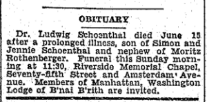 Wir wissen zurzeit nicht, wann Dr. Ludwig Schönthal dauerhaft aus dem Deutschen Reich ausgewandert ist. Er war zumindest 1930 in New York City. Dort ist er bereits im Juni 1934 im Alter von gerade einmal 35 Jahren an einer längeren Krankheit gestorben, wie das Jewish Daily Bulletin aus New York am 17. Juni 1934 berichtete. Ursache könnte die im Ersten Weltkrieg erlittene Gasvergiftung gewesen sein.