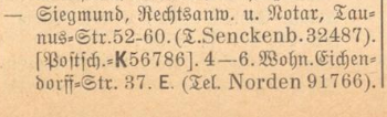 Von 1914 bis 1918 leistete Siegmund Kaiser Kriegsdienst als Frontkämpfer und erhielt 1917 das Eiserne Kreuz 2. Klasse. Nach dem Ersten Weltkrieg eröffnete er erneut eine Kanzlei in der Kaiserstraße 6, wohnte nun aber in der Hochstraße 12. Im Juni 1923 wurde Siegmund Kaiser zum Notar ernannt. Allerdings entzogen ihm die Nationalsozialisten bereits im Juni 1933 das Notariat wieder, während er als früherer Frontkämpfer weiterhin als Rechtsanwalt tätig bleiben durfte. 1932 (und bis 1938) befand sich die Kanzlei von Siegmund Kaiser in der Taunusstraße 52-60. Er wohnte in diesem Zeitraum in der Eichendorffstraße 37. Erstmals 1939 findet sich im Frankfurter Adressbuch kein Eintrag mehr für Siegmund Kaiser. Er arbeitete nach Entzug der Rechtsanwaltszulassung bis zu seiner Verhaftung im Juli 1942 als Konsulent und durfte daher nur noch Juden juristisch betreuen.