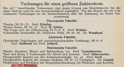 Dr. Ernst Witebsky then worked at the Third Medical Clinic of the University of Berlin and at the Institute for Experimental Cancer Research at the University of Heidelberg. In 1929, Ernst Witebsky habilitated at the University of Heidelberg with the thesis "Dispositionibilität und Spezifität alkohollöslicher Strukturen von Organen und bösartigen Geschwülsten", which was also published in the "Zeitschrift für Immunitätsforschung und experimentelle Therapie". In June 1929, he was awarded the venia legendi for immunology and serology by the Medical Faculty of the University of Heidelberg. He taught in Heidelberg from the winter semester of 1929/30 until the summer semester of 1933 as a private lecturer. In the summer semester of 1931, for example, he lectured on "Results and problems of blood group research". This lecture was intended for medical and legal students. In 1933, Ernst Witebsky's teaching license was revoked by the National Socialists because he was Jewish, although he had been a Swiss citizen since at least 1925.