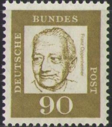 In July 1940, Franz Oppenheimer and his daughter Renate were finally allowed to immigrate to the USA. They settled in Los Angeles, where Oppenheimer's sister Elise Steindorff also lived. Here he published again, mainly in the journal "The American Journal of Economics and Sociology". Renate Oppenheimer worked as an assistant to film authors and doctors and as a secretary to the former Berlin psychoanalyst Ernst Simmel in New York, earning a living for both of them. Franz Oppenheimer died on September 30, 1943, at the age of 80. A Deutsche Bundespost stamp in the "Important Germans" series was issued in 1964 to mark his 100th birthday. Franz Oppenheimer's urn was transferred to Frankfurt on the Main in 2007. He was given a grave of honor in the South Cemetery.