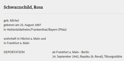 Rosa Schwarzschild, née Michel, was deported from Frankfurt on the Main to German occupied Raasiku near Reval together with her husband Julius Schwarzschild in September 1942 and murdered there. Julius Schwarzschild had already been arrested in connection with the November 1938 pogroms and imprisoned in Dachau concentration camp from November 12 to December 16, 1938. At present, we do not know whether Rosa and Julius Schwarzschild's child was able to escape the Nazi persecution of the Jews.
